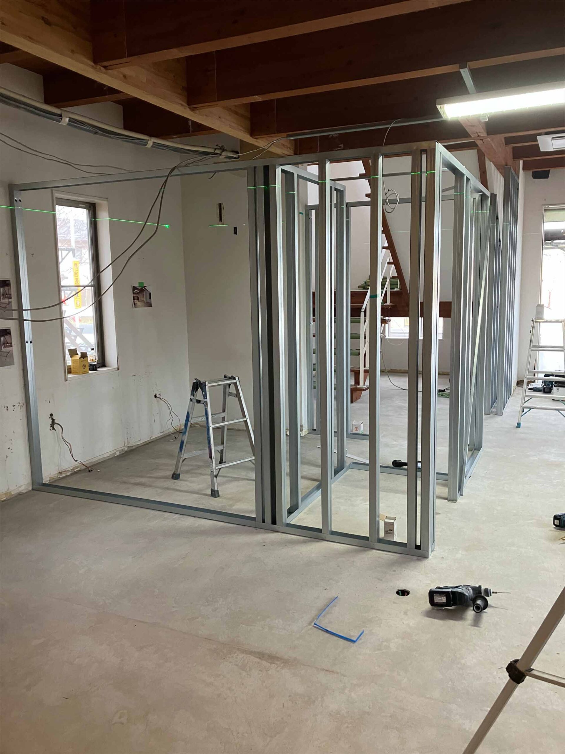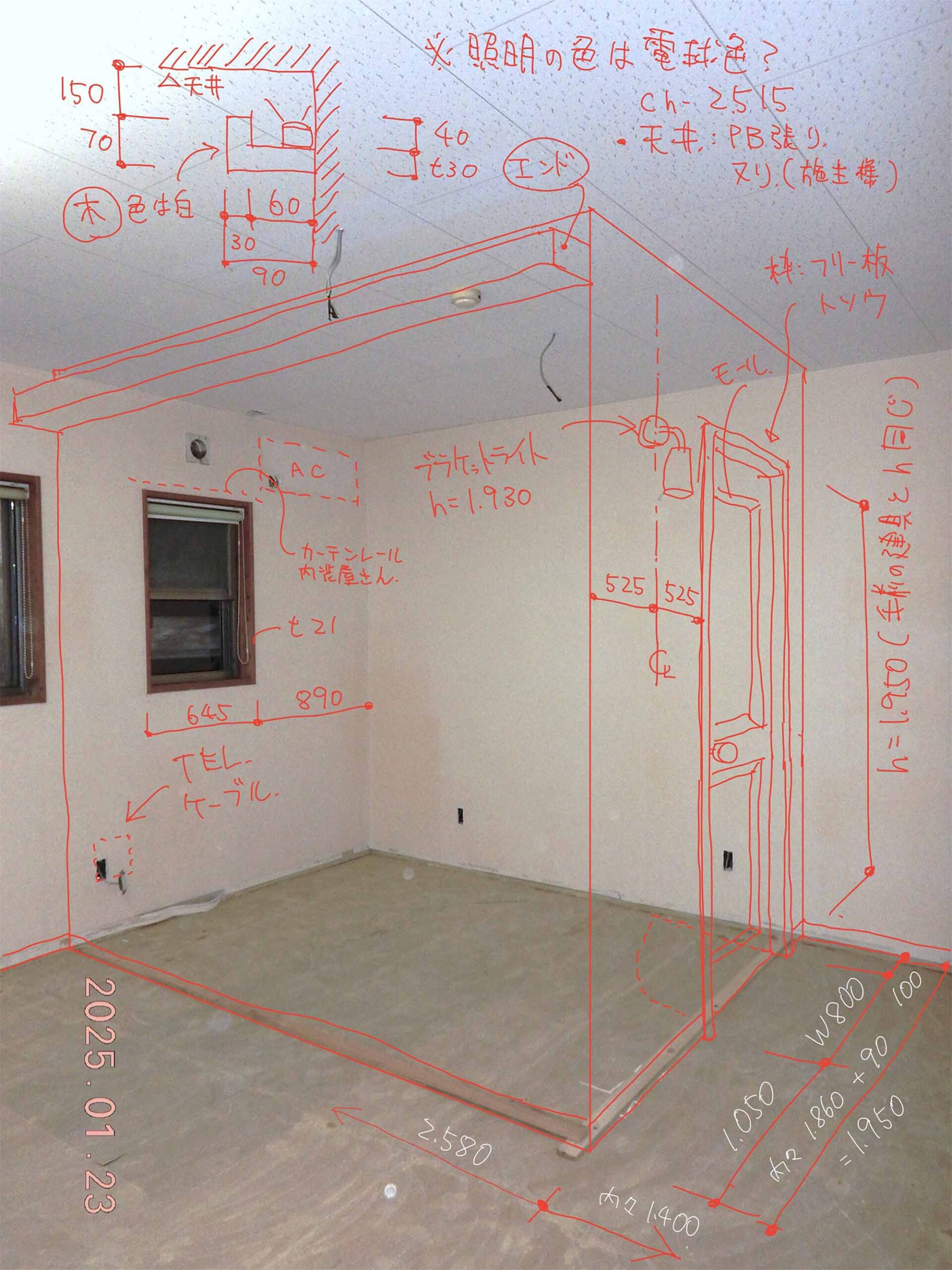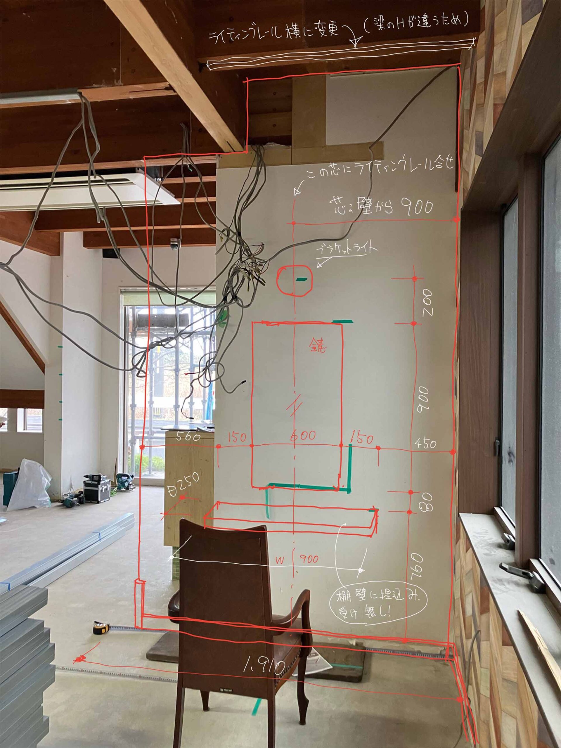 | 施工内容 | 意匠デザインの先生とオーナー様のイメージを実現するため、工事の途中から施工チームとして参加させていただきました。図面が手書きのまま進行する場面もあり、夜遅くまで打合せを重ねながら、棚の位置や壁面、入り口の大きさなどを現地で一つ一つ確認・決定し、施工に反映していきました。 特に印象的だったのは照明の設計で、空間を活かしたライティングレールの配置や照明の種類を、意匠の先生が現場で即座に的確に判断された点です。その結果、完成後は見た目にも美しく、非常に洗練された空間となり、ご満足いただける仕上がりとなりました。 |