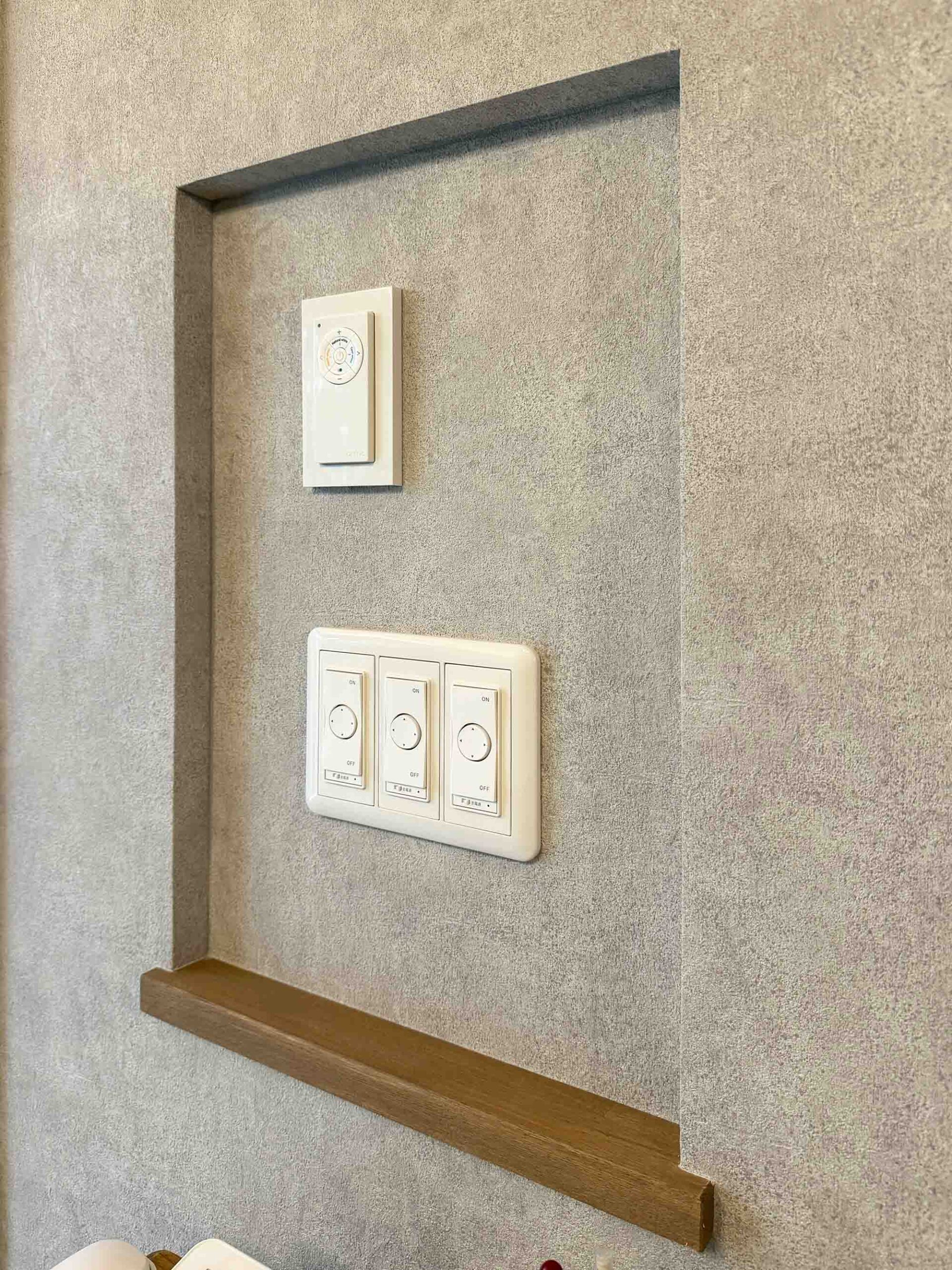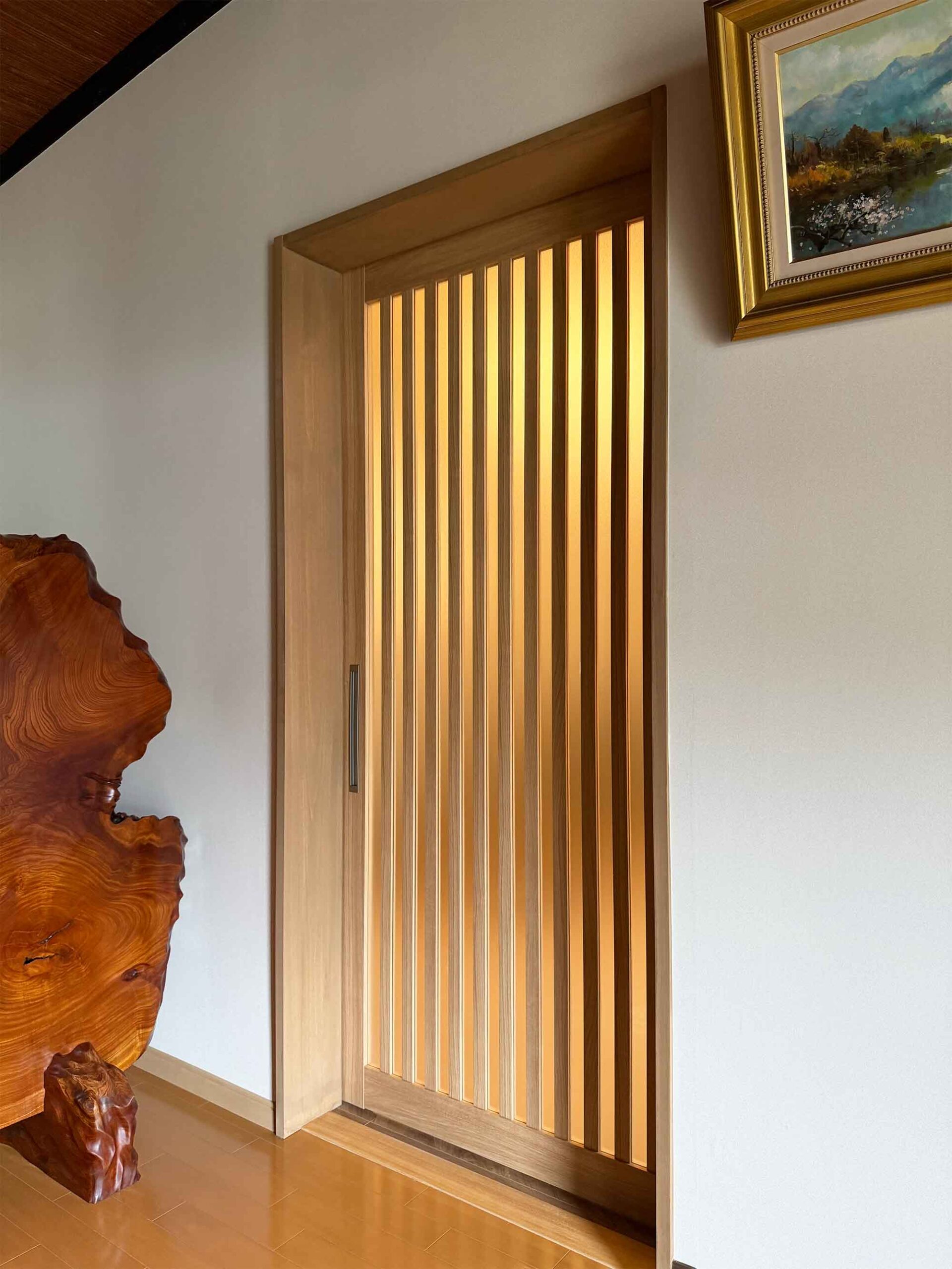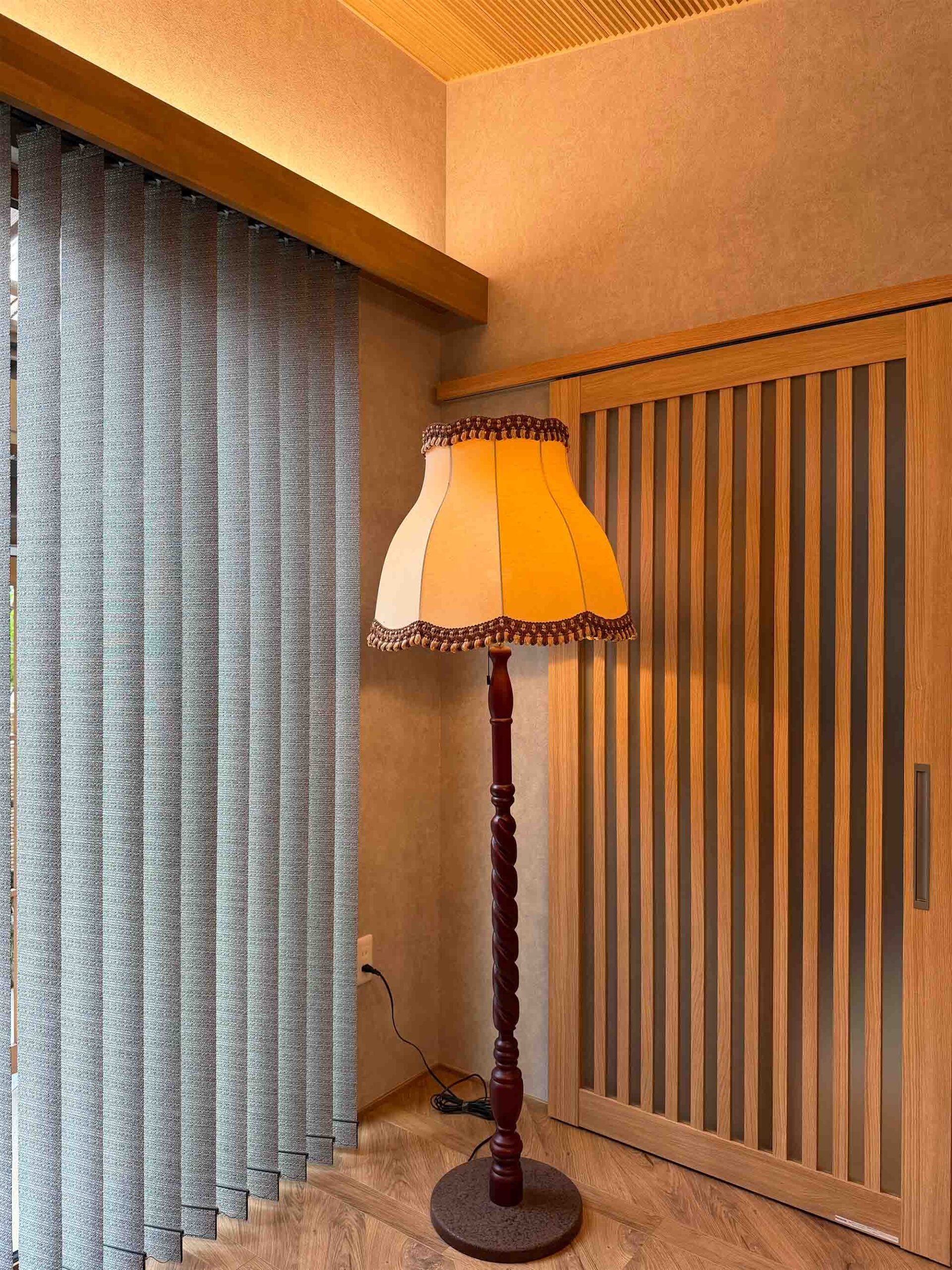 また、断熱性と意匠性を兼ね備えた3m幅の大開口サッシに交換。そこへ縦型のバーチカルブラインドを設置し、さらにその上部には間接照明を組み込むことで、ホテルライクな上質空間へと生まれ変わりました。断熱材の施工も行っており、見た目だけでなく快適性も大きく向上しています。