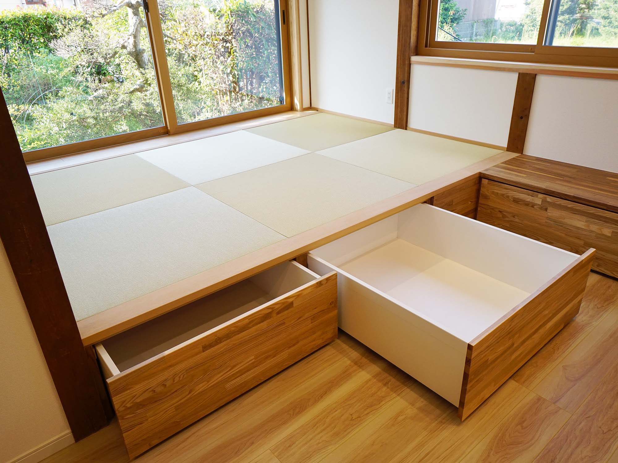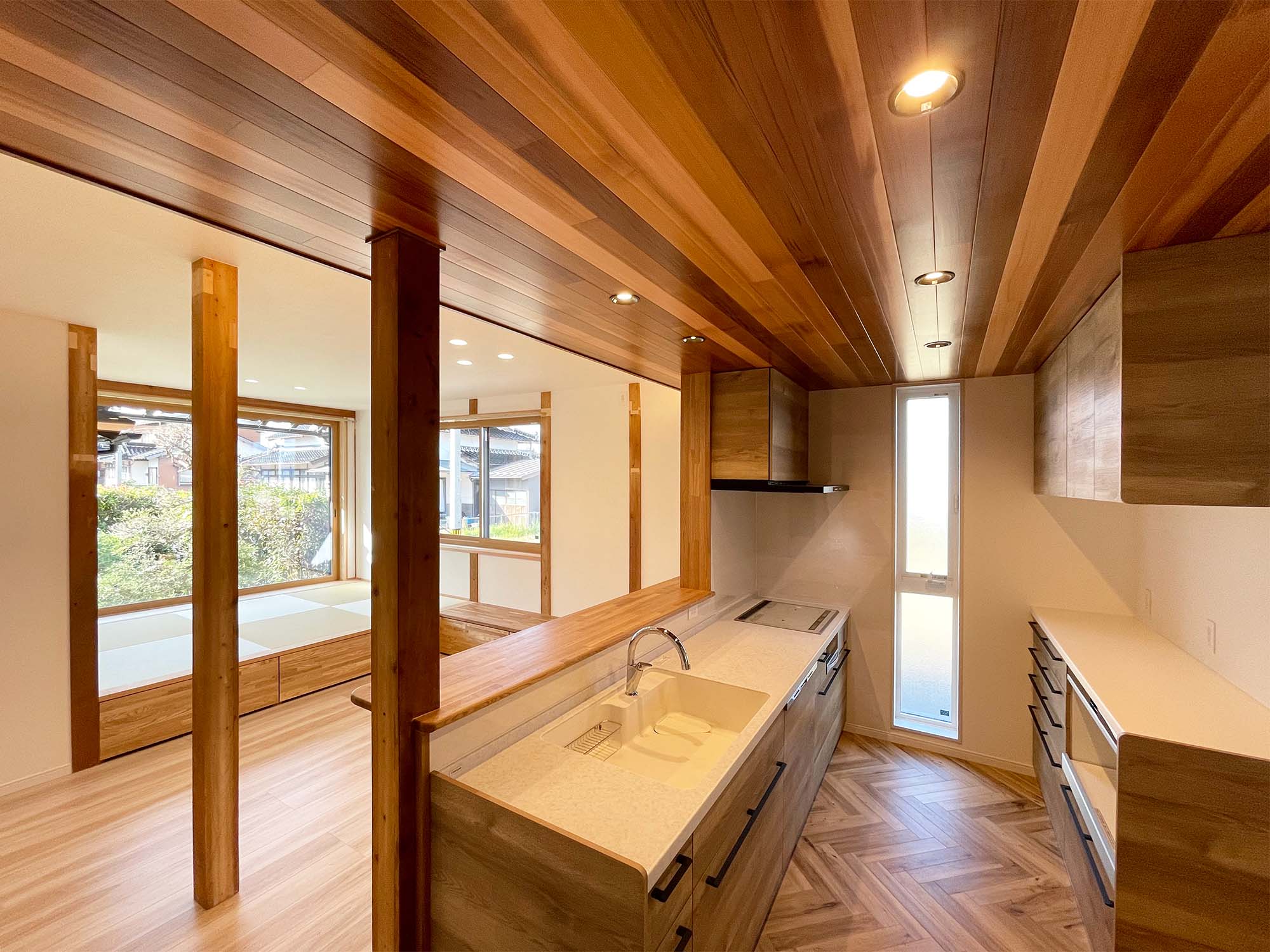 施工内容段差の解消と間取りの見直しを行い、廊下と部屋を一体化させることで広々としたリビング空間を実現しました。1階の和室もリビングとつなげ、腰掛けとして活用できる設計に。天井は既存の梁を活かした勾配天井とし、開放感のある空間に仕上げました。