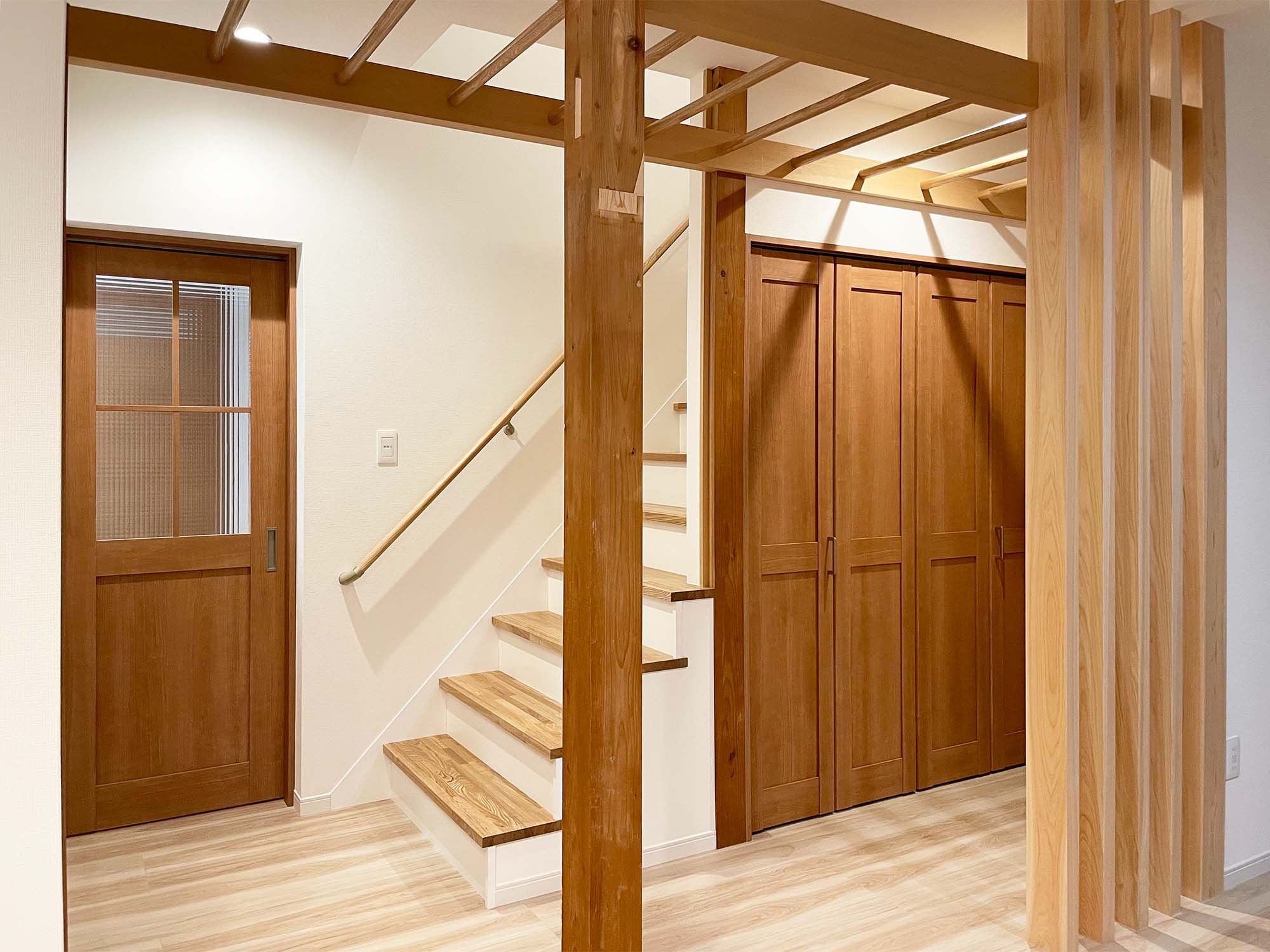 また、手すりを活用した「うんてい」を設置し、現在は物干しとしても活用できる多機能な空間に。階段下には家族の目に留まりやすいニッチを設け、マグネット対応の連絡ボードとして使える工夫も取り入れました。