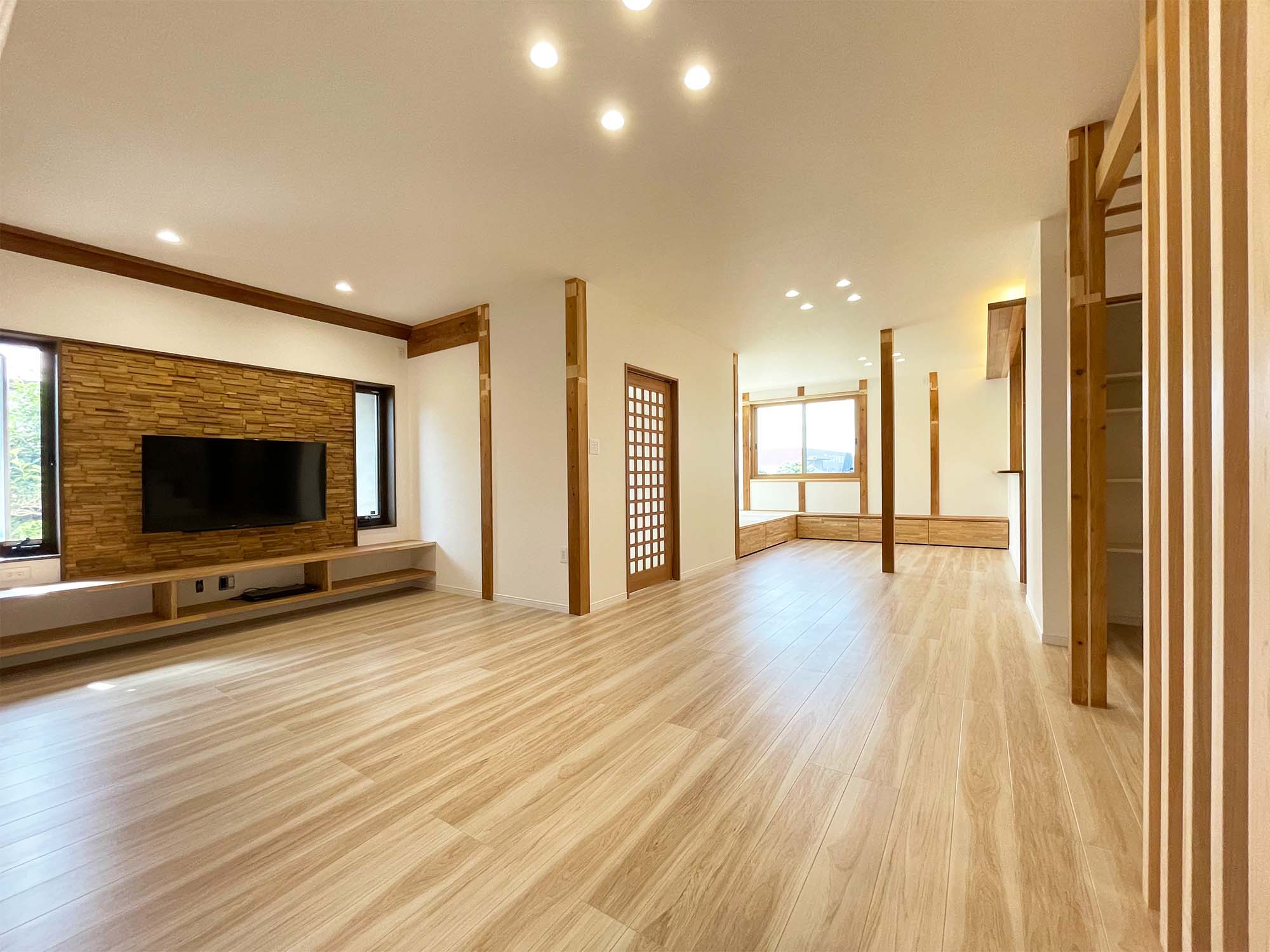 キッチンは対面式に変更し、内装には傷のつきにくいフロアタイルや無垢材の下がり天井を採用するなど、デザインと機能性を両立。壁掛けテレビの背面には木のモザイクタイルを施し、空間にアクセントを加えています。テレビ台や玄関の下足収納はオーダーメイドで製作し、統一感のある仕上がりとなりました。